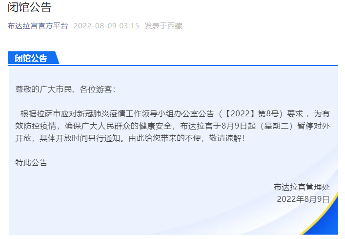 据布达拉宫官方平台消息,根据拉萨市应对新冠肺炎疫情工作领导小组办公室公告(【2022】第8号)要求 ,为有效防控疫情,确保广大人民群众的健康安全,布达拉宫于8月9日起(星期二)暂停对外开放,具体开放时间另行通知。