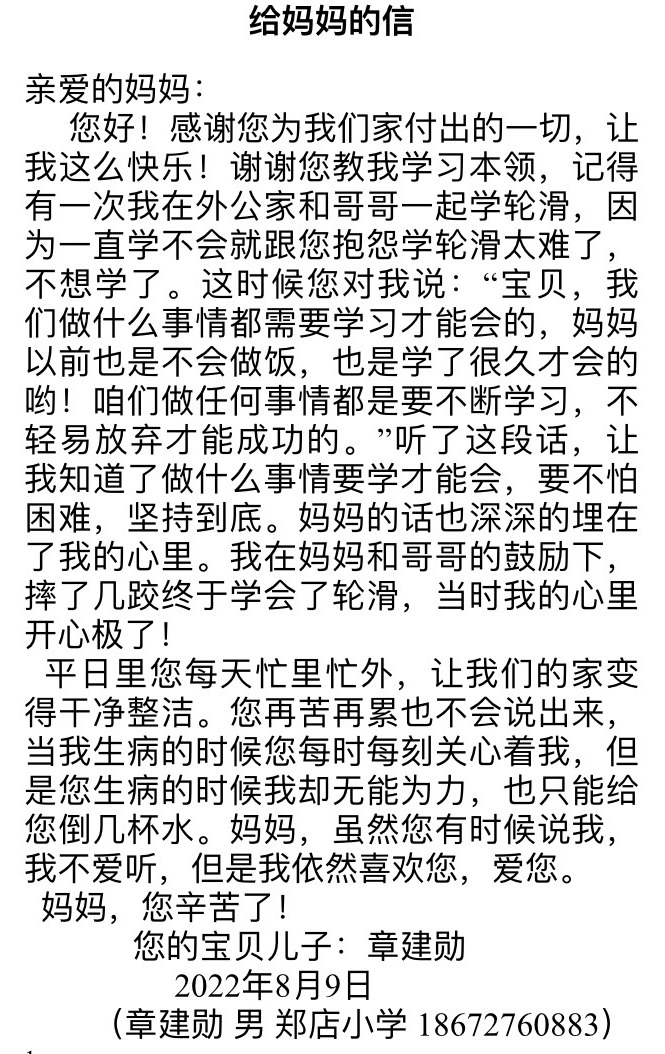 今天,“少年领读者·一封家书”编辑组收到了来自武汉市郑店小学章建勋同学的一封信。