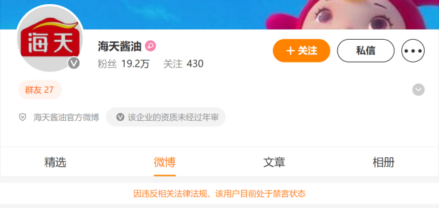 记者发现,目前,海天味业与海天酱油官方微博均处于禁言状态,禁言原因是违反相关法律法规。