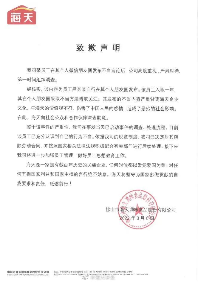 针对海天一员工在个人朋友圈发表不当言论一事,8月6日,海天味业深夜发布致歉声明称,该内容为员工吕某某自行在其个人朋友圈发布。该员工入职一年,其在个人朋友圈采取不当方法博取关注。其发布的不当内容严重背离企业文化,与企业价值观不符,伤害了中国人民的感情,造成了恶劣的社会影响。对此,海天深表歉意。