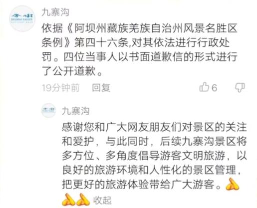 同时,景区在官方社交账号回应,已对当事游客行政处罚,四人以书面道歉信的形式进行了公开道歉。