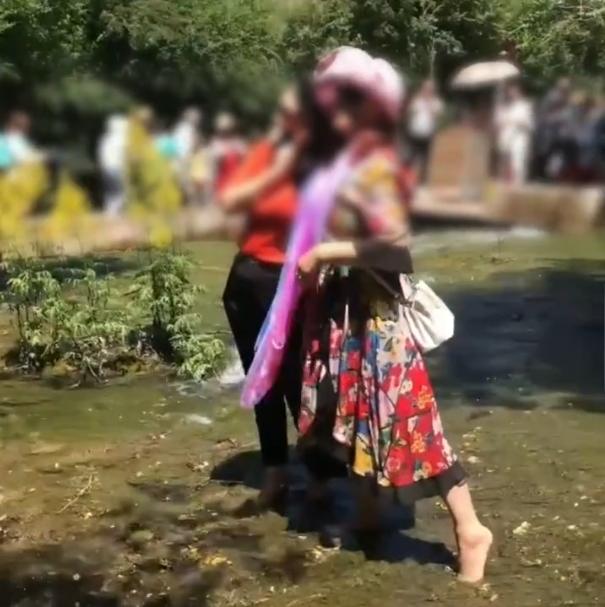 近日,四川阿坝州。网友爆料九寨沟景区内几名大妈脱鞋下水打卡拍照。