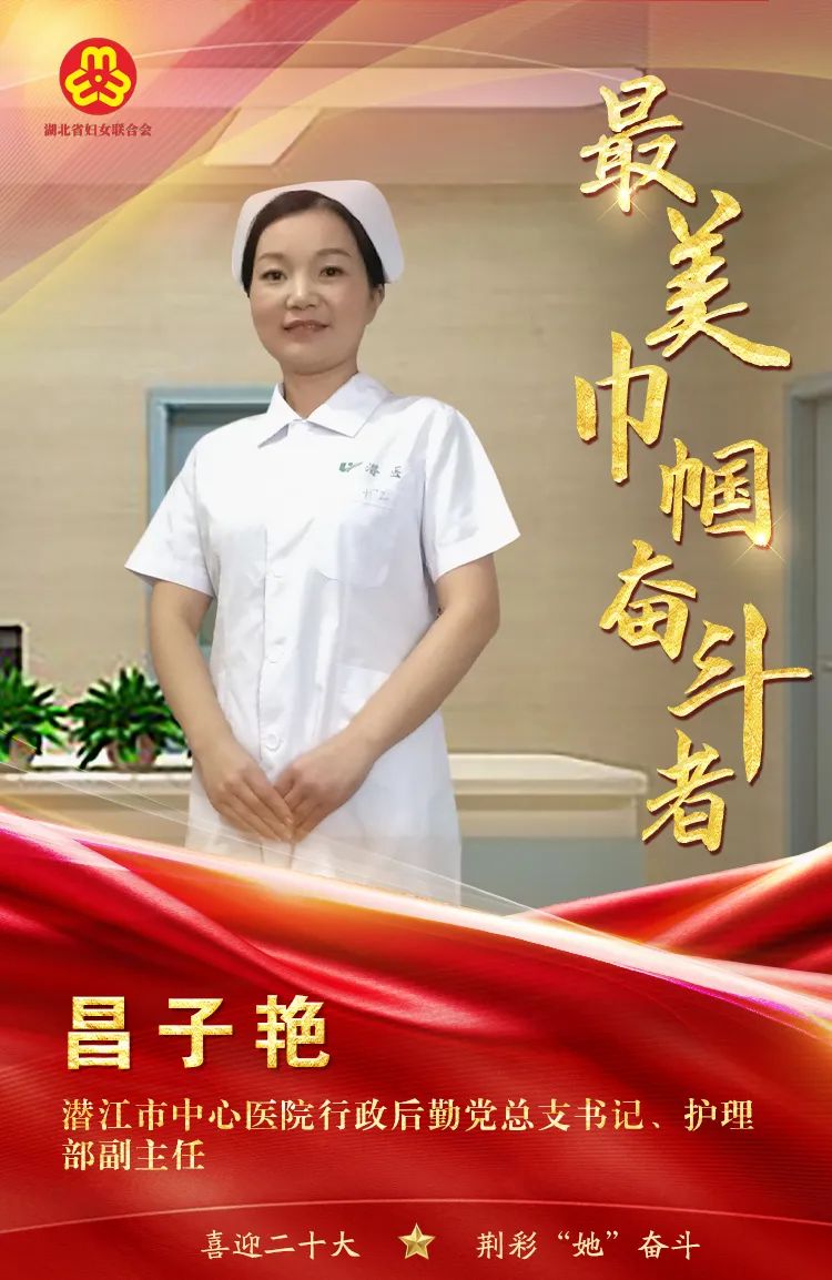 昌子艳,中共党员,副主任护师,现任潜江市中心医院行政后勤党总支书记、护理部副主任。