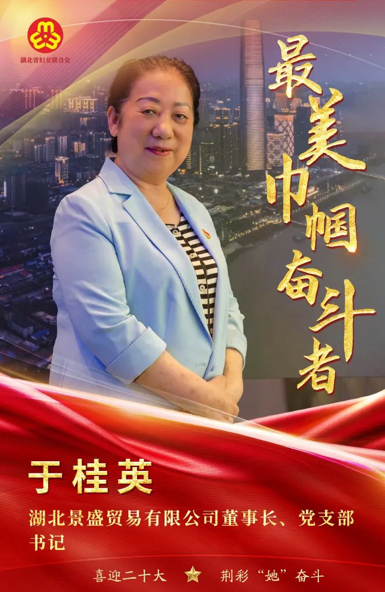 于桂英,湖北景盛贸易有限公司董事长、党支部书记。先后荣获2011年“武汉民营经济年度优秀人物”、2012年“武汉民营经济年度十大杰出人物”、2021年“湖北省三八红旗手”、2021年“湖北省百名优秀创业女性人才”等殊荣。
