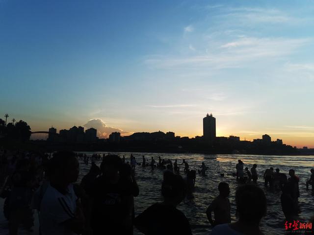 “江边人实在太多了,至少上千人,男女老少都有,感觉好危险,尤其是小朋友。”段先生告诉红星新闻记者,江边的情景让他们吃惊不小,也感觉在此戏水很危险。“有很少的人带了救生设备,绝大多数人什么都没带。”段先生说,虽然岸边有工作人员劝告市民不要下水,但根本没人听劝,水中人群密密麻麻如同“下饺子”。