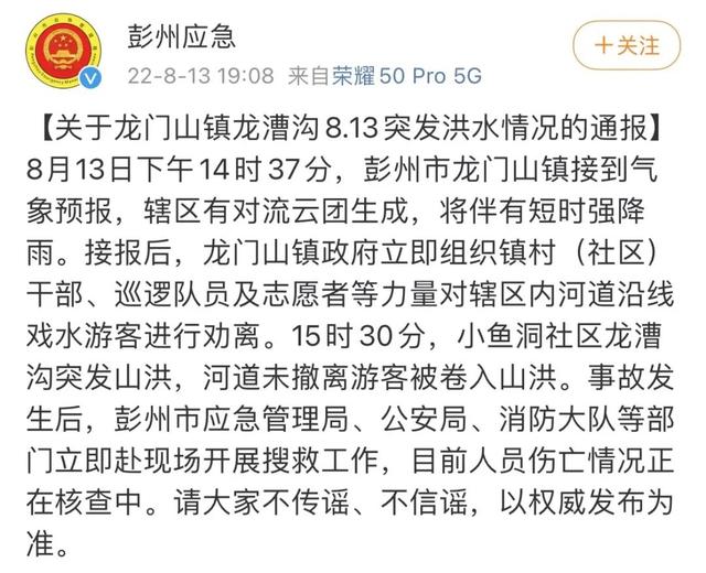8月13日下午14时37分,彭州市龙门山镇接到气象预报,辖区有对流云团生成,将伴有短时强降雨。接报后,龙门山镇政府立即组织镇村(社区)干部、巡逻队员及志愿者等力量对辖区内河道沿线戏水游客进行劝离。15时30分,小鱼洞社区龙漕沟突发山洪,河道未撤离游客被卷入山洪。事故发生后,彭州市应急管理局、公安局、消防大队等部门立即赴现场开展搜救工作,目前人员伤亡情况正在核查中。请大家不传谣、不信谣,以权威发布为准。