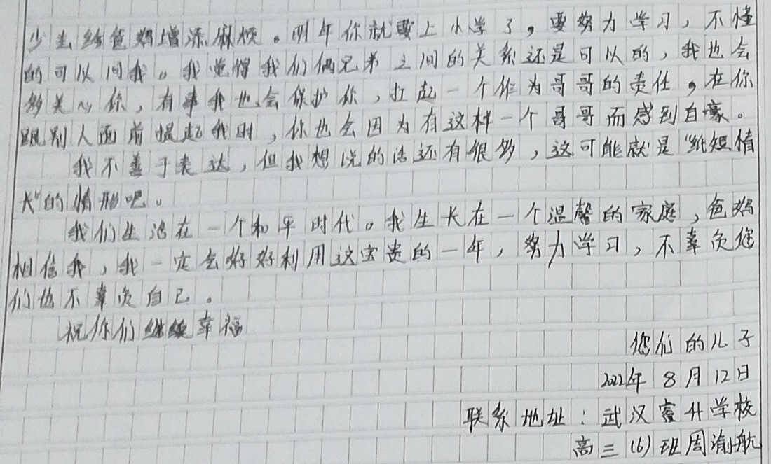 今天,“少年领读者·一封家书”编辑组收到了来自武汉市睿升学校周渝航同学的一封信。