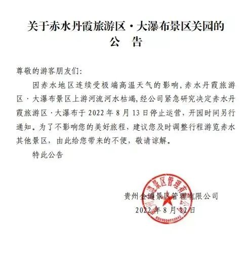 8月12日,“赤水旅游”公众号发布消息称,因赤水地区连续受极端高温天气的影响,上游河流河水枯竭,赤水丹霞旅游区·大瀑布景区于8月13日停止运营,开园时间另行通知。