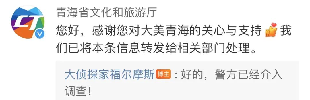 当晚,青海省文化和旅游厅官方微博在该举报帖下回复称,“感谢您对大美青海的关心与支持,我们已将本条信息转发给相关部门处理。”