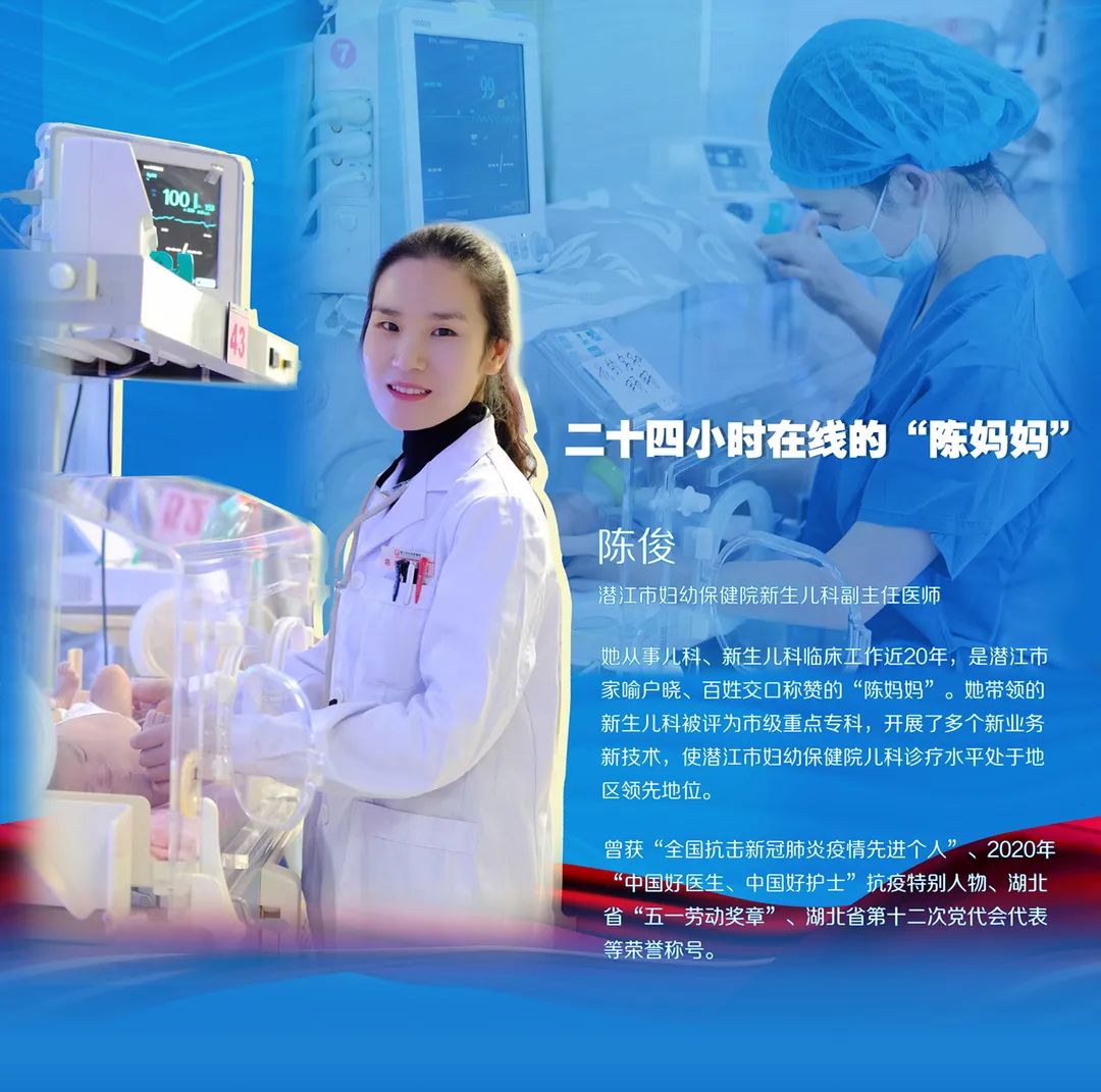 2020年2月12日晚,潜江市首例新冠肺炎疑似孕妇在市应急医院顺利行剖宫产术,冒着被感染的风险,陈俊作为新生儿科主任首当其冲迎难而上站在了最前面,她连夜与多科室会诊共同研究治疗方案,凭借多年实战经验,提出“立即剖宫产,保障母婴安全”的建议,当晚产妇便顺利分娩。她主动要求把管理新生儿这一难啃的“硬骨头”留给了自己。宝宝的呼吸极不稳定、发热、呕吐……她连续三天不曾合眼,二十多天的细心照顾,母女健康出院了。孩子家属无法表达心中的谢意,眼含泪水对她说:“谢谢陈妈妈!谢谢大家!你们就像夜空里最亮的星星,点亮我们心中希望的明灯”。此病例也为全国新生儿新冠肺炎临床研究提供了重要的研究数据。