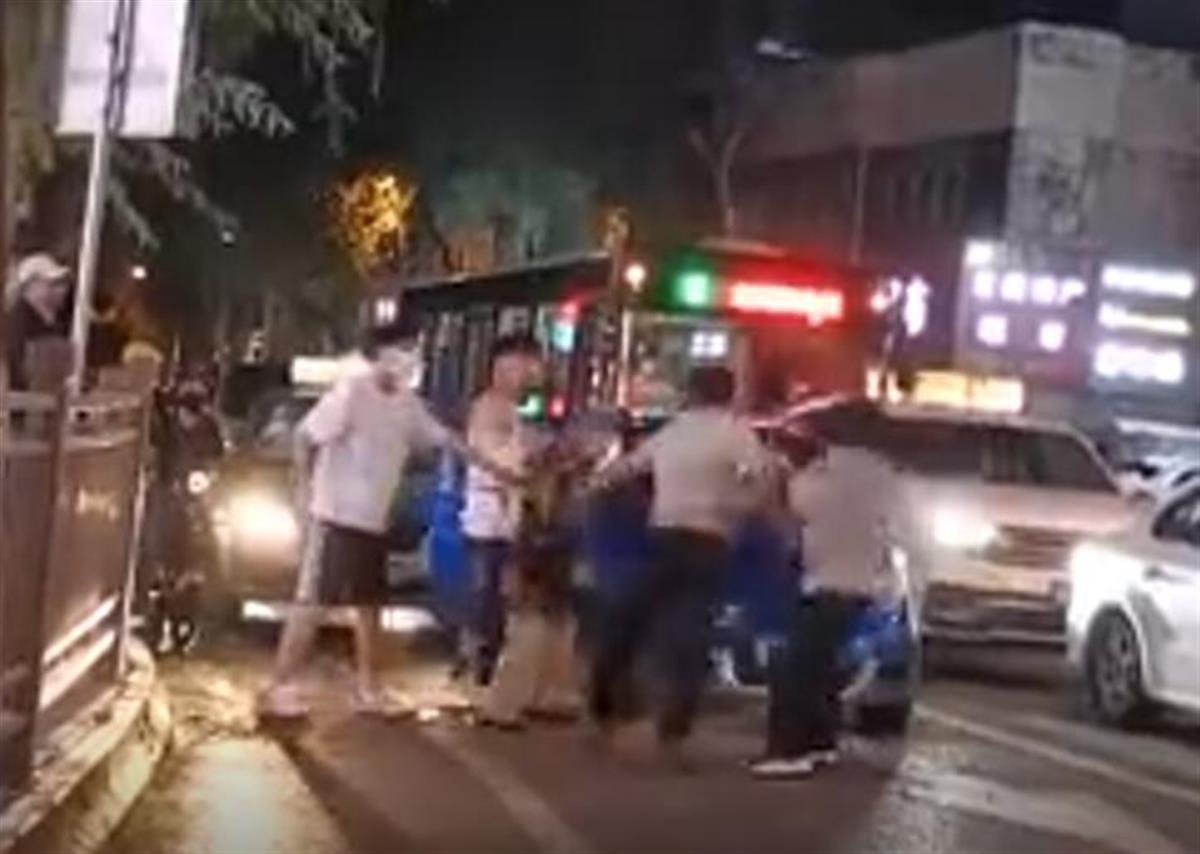 一段现场视频显示,马路上一前一后停着一辆蓝色轿车和一辆出租车,一男子的白色T恤衫被撕烂。另有一名身穿浅褐色上衣的男子欲上前殴打他,但被两名女子拉着,白衣男子趁机跑到出租车旁边躲避。视频显示,浅褐色上衣的男子手中持有异物。