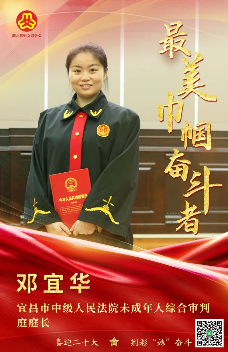 邓宜华,宜昌市中级人民法院未成年人综合审判庭庭长。在维护妇女儿童权益暨“平安家庭”建设的司法保护工作上,邓宜华有着强烈的责任感和使命感。2018年以来共办结涉少刑事、家事等民商事各类案件共420件,担任审判长参与合议的案件共923件,历年结案率均在98%以上,其中60%的案件为婚姻家庭、继承类家事纠纷。她带领全庭干警以“巾帼不让须眉”之姿,充分发挥自身优势,全面提升家事审判质效,完善家事审判改革,助力维护妇女儿童合法权益。撰写的民事判决书曾在全国首届“百篇优秀裁判文书”评选活动中荣获优秀裁判文书三等奖,承办的案件曾获2018年湖北法院精品案件二等奖,宜昌市法院“十佳精品案件”;2018至2021年度被评为全省维护妇女儿童先进个人,她所在的未成年人综合审判庭也荣获全国青少年维权岗,宜昌市巾帼文明岗,全省政法队伍先进单位,全省法院平安家庭建设先进集体。