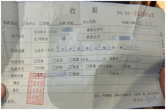 刘女士说:“我觉得他是蓄意诈骗,他已经出现这种困境了,我7月27号还续费了一年。他已经面临倒闭、关门啦,他还在让我们续费,而且我孙子一节课都没上,打折以后13000多块钱,原价是18000多元,因为这回折扣还特别大,你说他是不是成心框钱,他原先没有这么大的折扣的,这次折扣是最大的。”