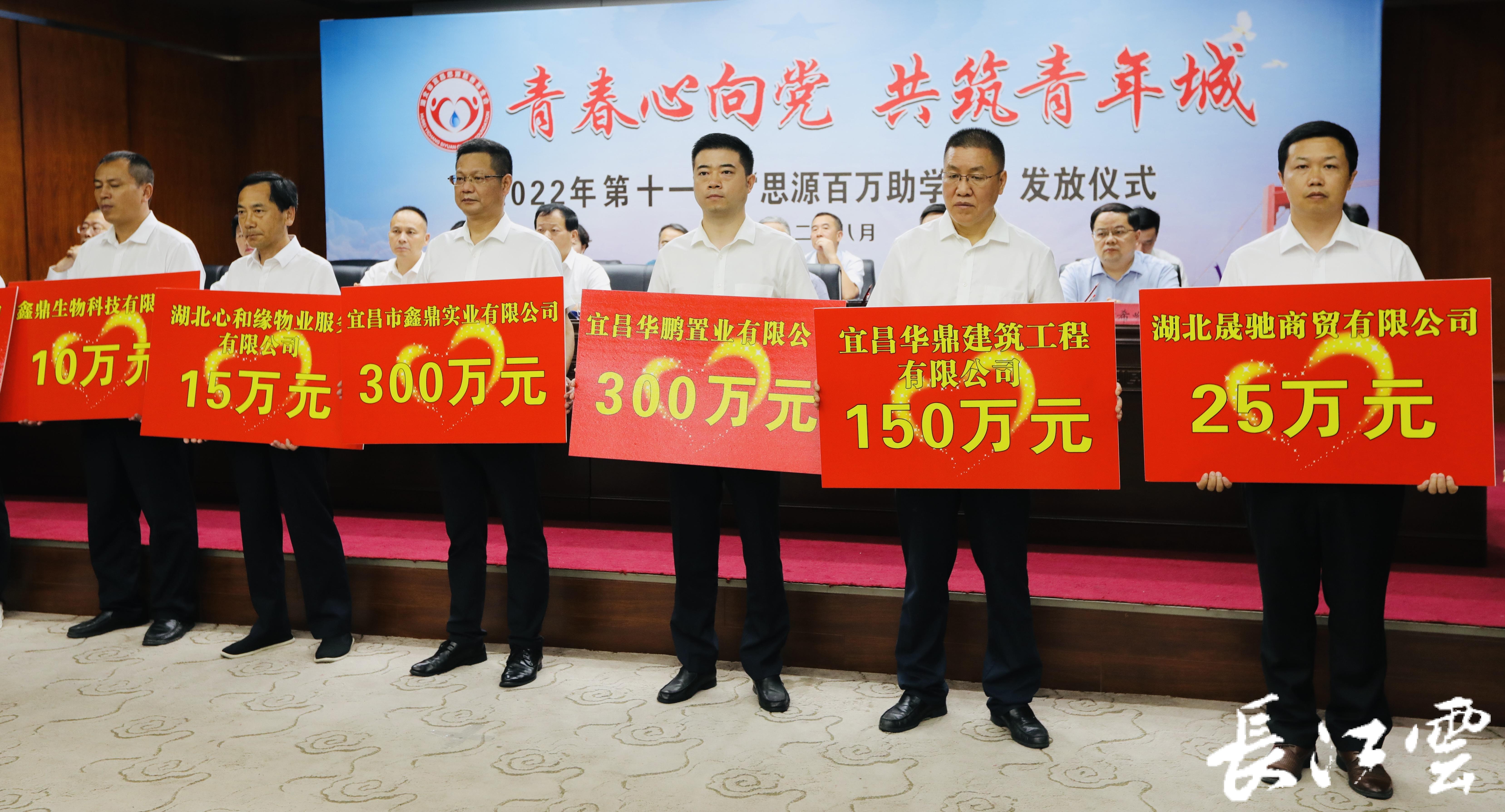 8月18日上午,由中国民主建国会宜昌市委员会、湖北省宜昌思源慈善基金会、宜昌市工商业联合会、鑫鼎集团、宜昌三峡新闻传媒中心、宜昌市慈善总会、宜昌市红十字会、共青团宜昌市委员会联合发起的第十一届“思源百万助学”活动在鑫鼎大厦举行助学金发放仪式,现场为61名贫困学生共计发放思源助学金每人每年5000元,直至该阶段学业完成。11家爱心单位向思源慈善基金会捐赠善款共计855万元。