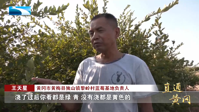 黄冈市黄梅县独山镇黎岭村蓝莓基地负责人 王天星:“你们看我们的蓝莓,浇水与不浇水的效果是不一样的,浇了过后你看都是绿、青色,没有浇都是黄色的。”