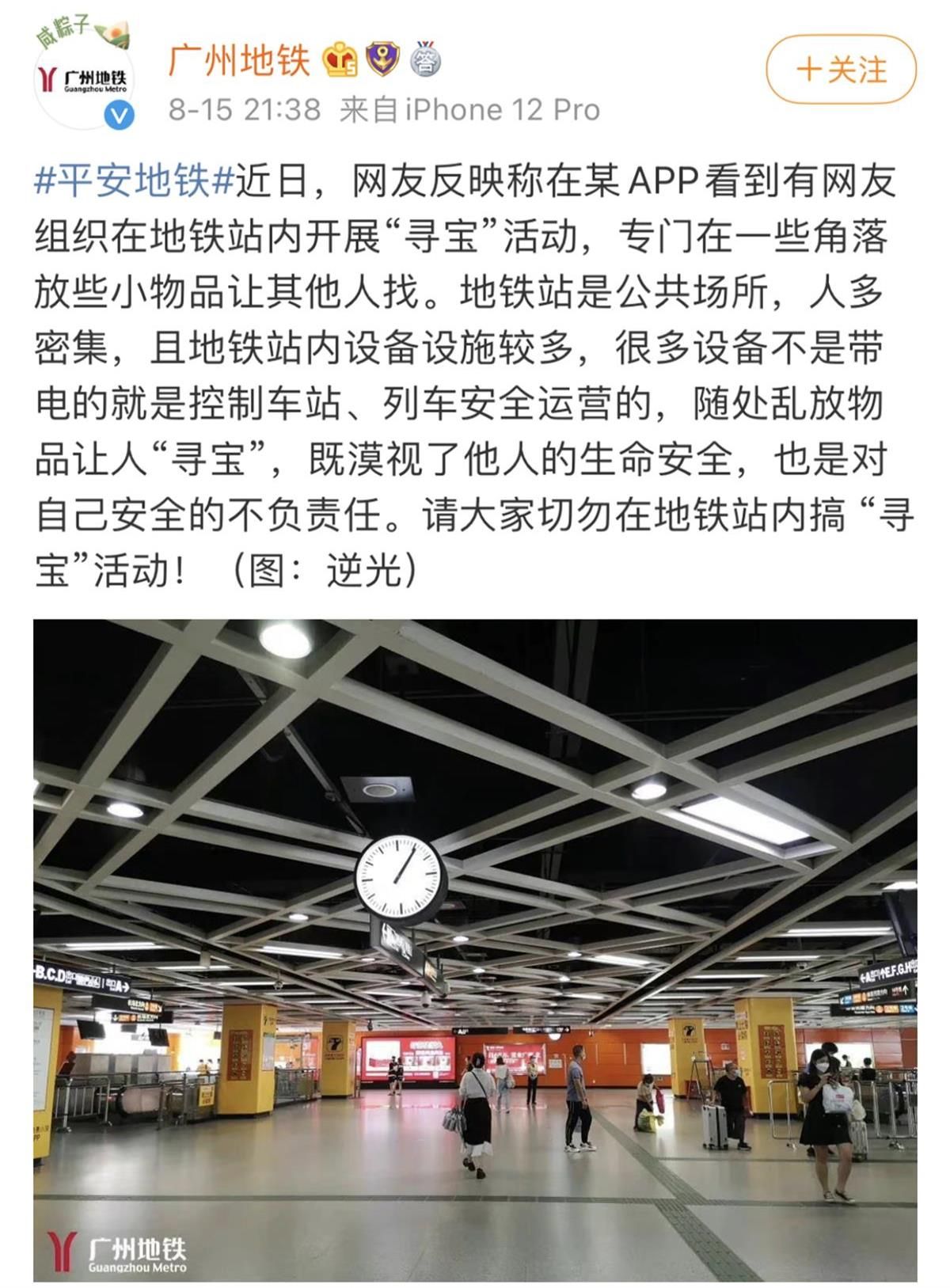 8月15日,广州地铁官方发布公告称,地铁站是公共场所、人多密集,且地铁站内设备设施较多,很多设备不是带电的就是控制车站、列车安全运营的,随处乱放物品让人“寻宝”,既漠视了他人的生命安全,也是对自己安全的不负责任。请大家切勿在地铁站内搞 “寻宝”活动。