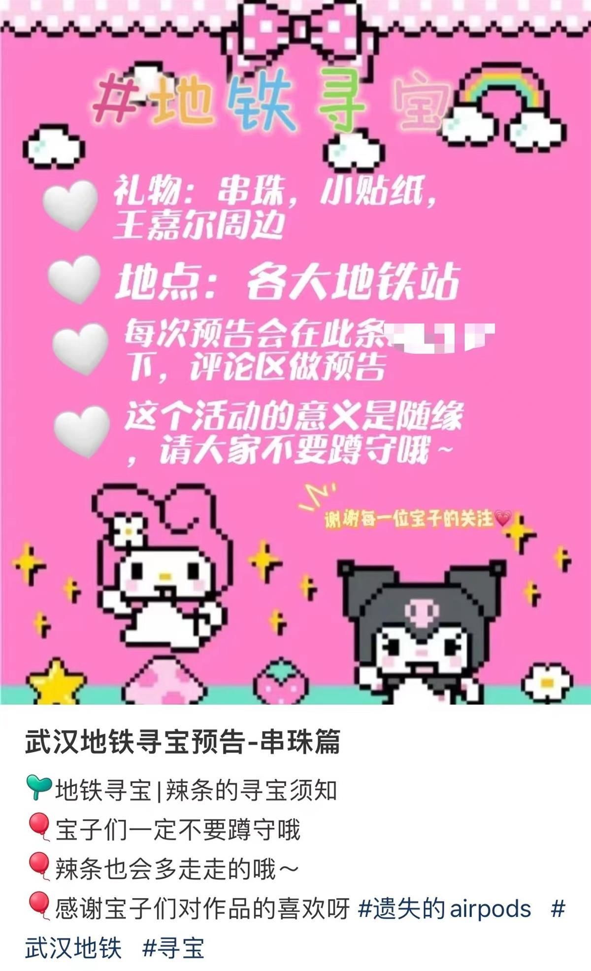 记者注意到,本月以来,武汉已有不少网友参与“地铁寻宝”活动,“寻宝”地点遍布武汉城区各大地铁站。发布者将自制的手链、头绳、戒指等小物件随机放至某地铁站内隐蔽处,并在社交平台上发布图片或视频,随后就会有网友根据线索前去寻找。