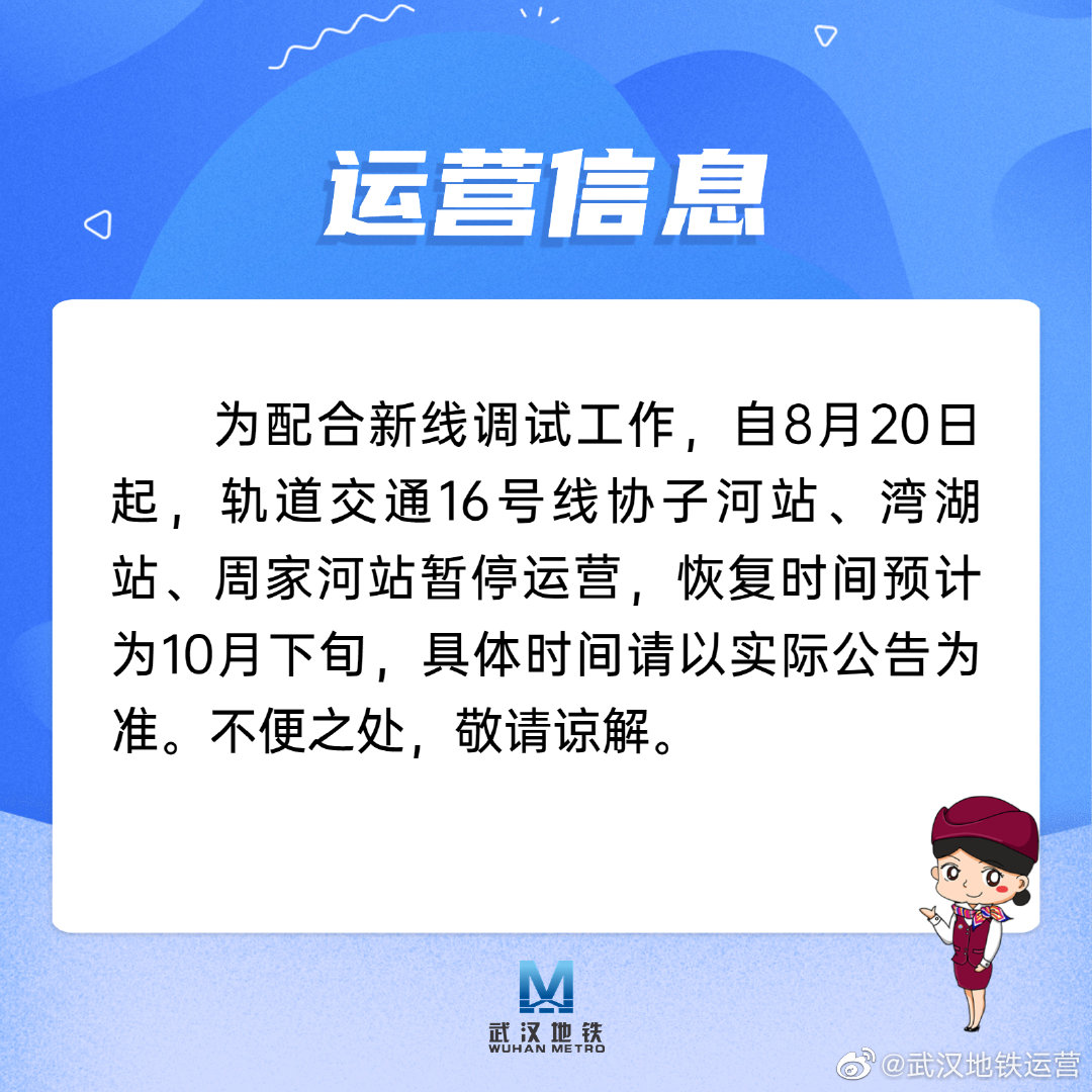 从@武汉地铁运营获悉,为配合新线调试工作,自8月20日起,轨道交通16号线协子河站、湾湖站、周家河站暂停运营,恢复时间预计为10月下旬,具体时间请以实际公告为准。不便之处,敬请谅解。