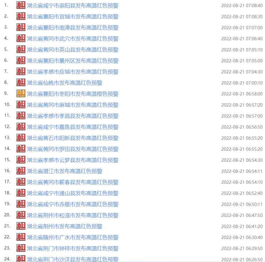 武汉中心气象台2022年08月21日06时41分发布高温红色预警信号:预计今天白天,除神农架、恩施高海拔地区外,湖北省大部地区最高气温将升至39~41℃,局部42~44℃,请注意防范!