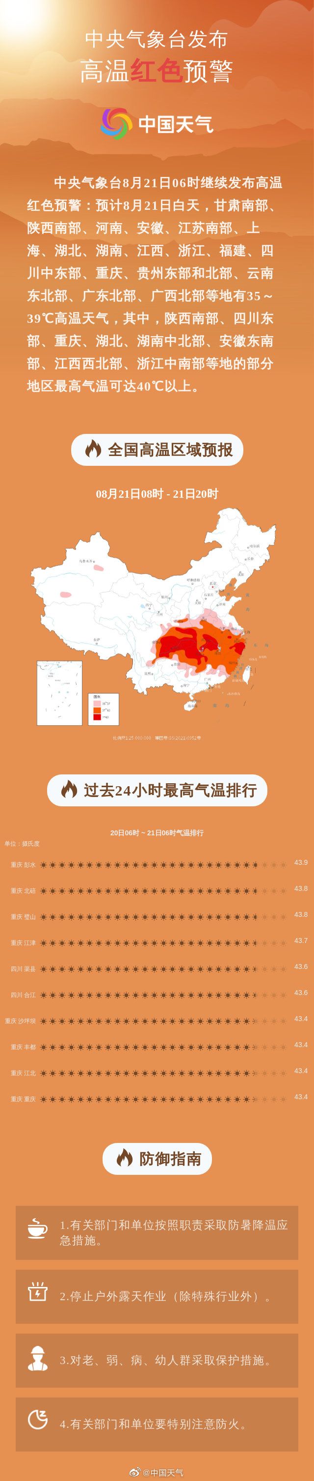 预计8月21日白天,甘肃南部、陕西南部、河南、安徽、江苏南部、上海、湖北、湖南、江西、浙江、福建、四川中东部、重庆、贵州东部和北部、云南东北部、广东北部、广西北部等地有35~39℃高温天气,其中,陕西南部、四川东部、重庆、湖北、湖南中北部、安徽东南部、江西西北部、浙江中南部等地的部分地区最高气温可达40℃以上。