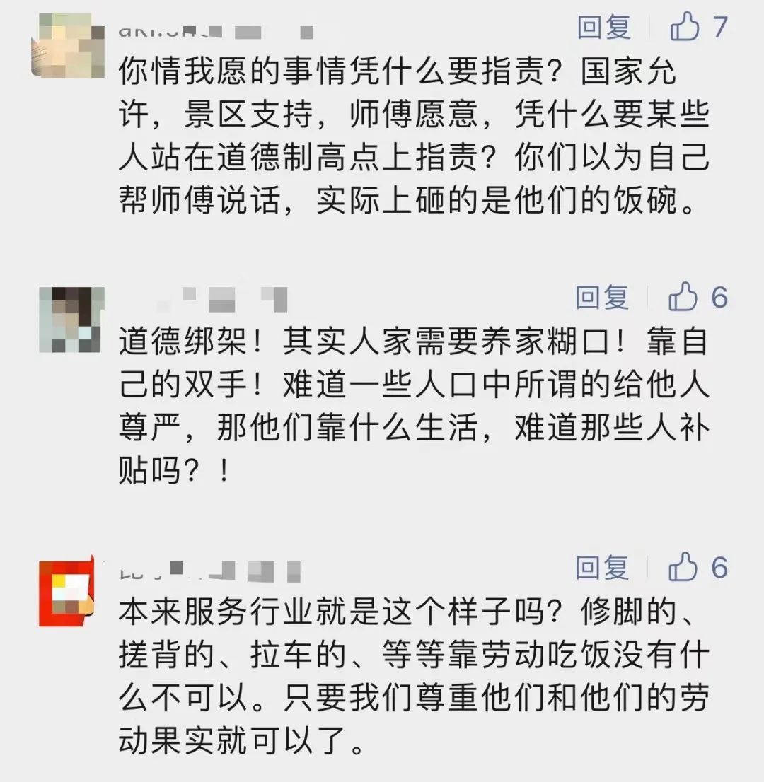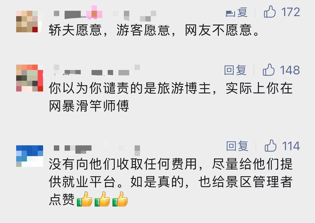 他们都是景区附近的农民,在景区凭力气挣钱吃饭。景区没有向他们收取任何费用,尽量给他们提供就业平台,对他们进行规范管理,并有一定的准入机制,必须是附近的老百姓,且身体健康才能进入景区服务。