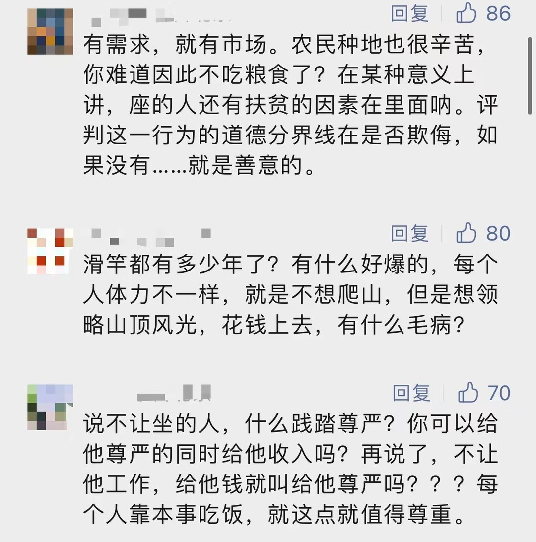 随后,记者联系到从事滑竿服务的倪师傅,他也是当天视频中的师傅之一。倪师傅表示,他是家里主要的劳动力,上有70多岁的父母,下有正在读中学的孩子。老婆是农村妇女,收入很有限。他在景区抬滑竿每个月可以挣3000-4000块钱,对于农村家庭来说是比较可观的。倪师傅表示:“肯定想让大家都来坐,我们要工作挣钱的嘛。”