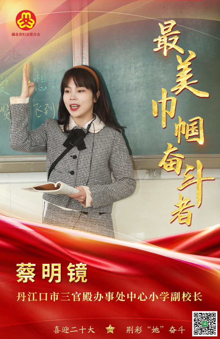 蔡明镜,女,丹江口市三官殿办事处中心小学副校长。2016年大学毕业后,她放弃城里就业的机会,来到南水北调库区边远的半岛教学点,开启了她青春铸梦的教师生涯。全校49名孩子中,33名是留守儿童。她陪伴孩子们同吃同住,给孩子们缝扣子,套被子,洗头发、剪指甲,让孩子们在学校也能感受到家一样的温暖。她勤学善研,借力互联网资源与技术,用五年的时光为大山的孩子开启了一扇通往知识与未来的大门,一起追逐人生最美好的梦想。