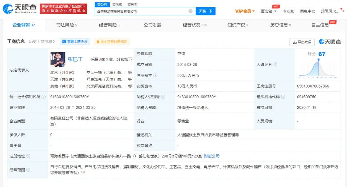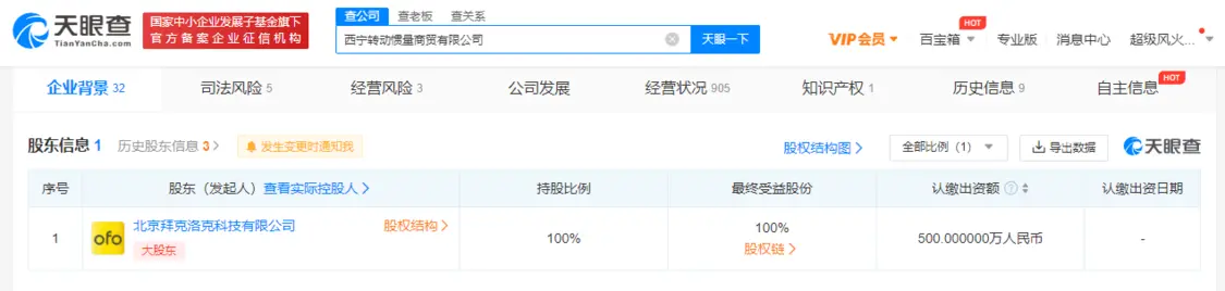 据天眼查App显示,ofo小黄车公众号关联公司西宁转动惯量商贸有限公司已经经营异常。据了解,该公司成立于2014年3月,注册资本500万人民币,法定代表人为张巳丁,经营范围包括自行车租赁及销售、户外用品租赁及销售等。股东信息显示,该公司由北京拜克洛克科技有限公司全资持股。