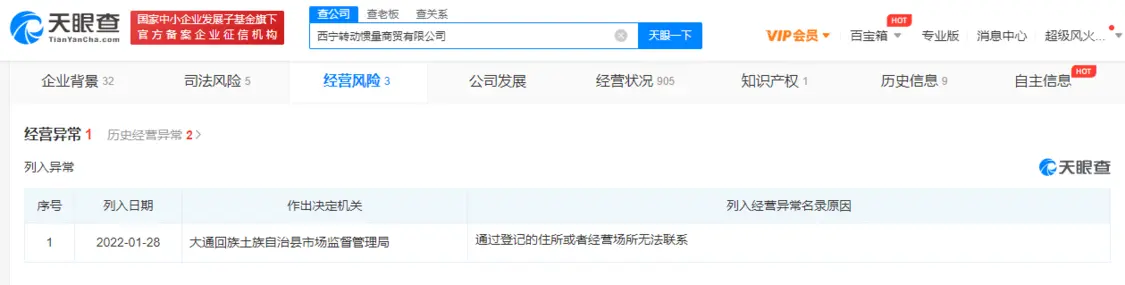 据风险信息显示,今年1月,该公司因通过登记的住所或者经营场所无法联系,被大通回族土族自治县市场监督管理局列入经营异常名录。