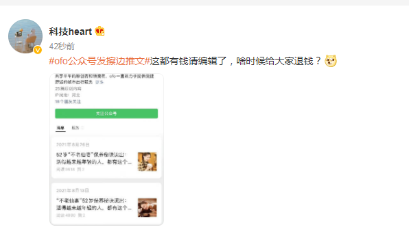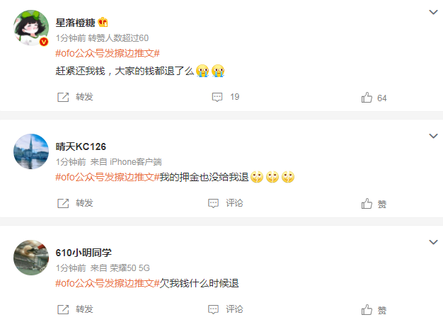 对于OFO小黄车利用热度发擦边球文案,网友纷纷吐槽:啥时候还我押金。