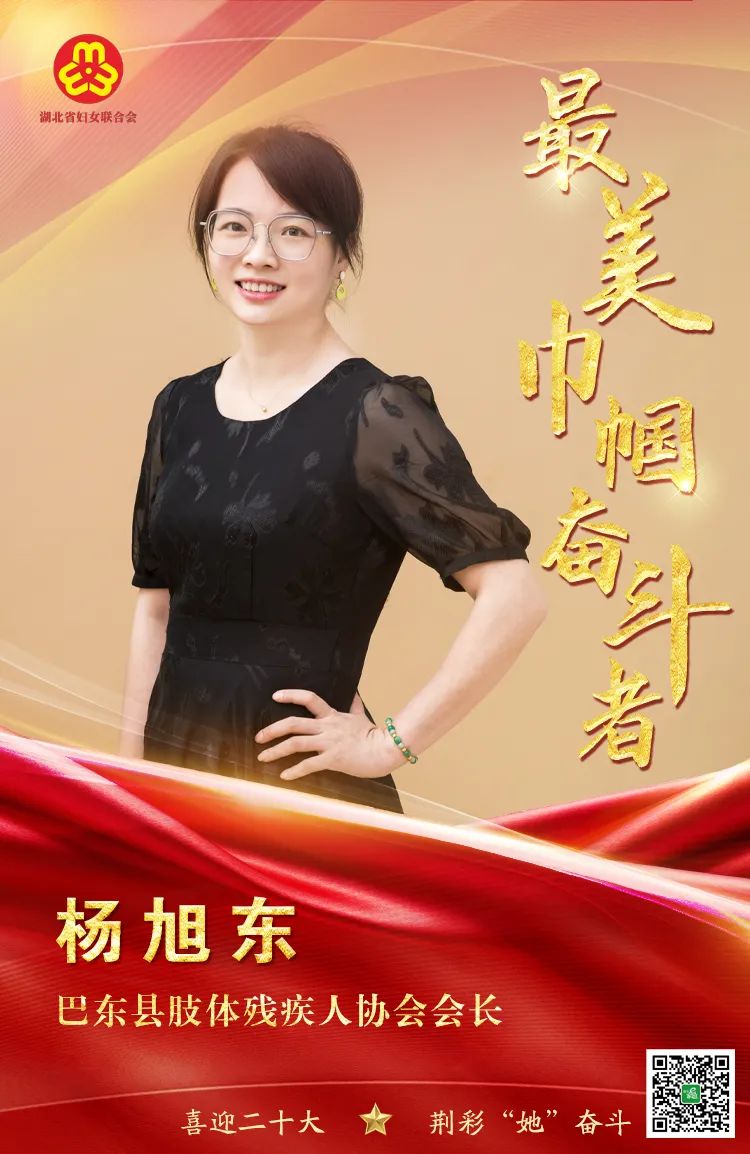 杨旭东,恩施州巴东人,5岁那年因一场车祸失去右腿。面对不幸,杨旭东没有向命运低头,她笑迎生活,用坚强的意志和乐观的心态克服各种困难。30年来,她凭借独腿和坚强的意志力完成学业,带动残友共同进步,2017年被选为巴东县肢残协会主席。她个人先后获得湖北省残疾人运动会女子举重56公斤级别金牌、湖北省第十二届运动会恩施州代表团先进个人、恩施州残联“生命之光”故事报告会“相依之星”、巴东县残联“蚕豆技能之星”等荣誉,其所在家庭先后获得巴东县“最美家庭”、恩施州“文明家庭”等荣誉。