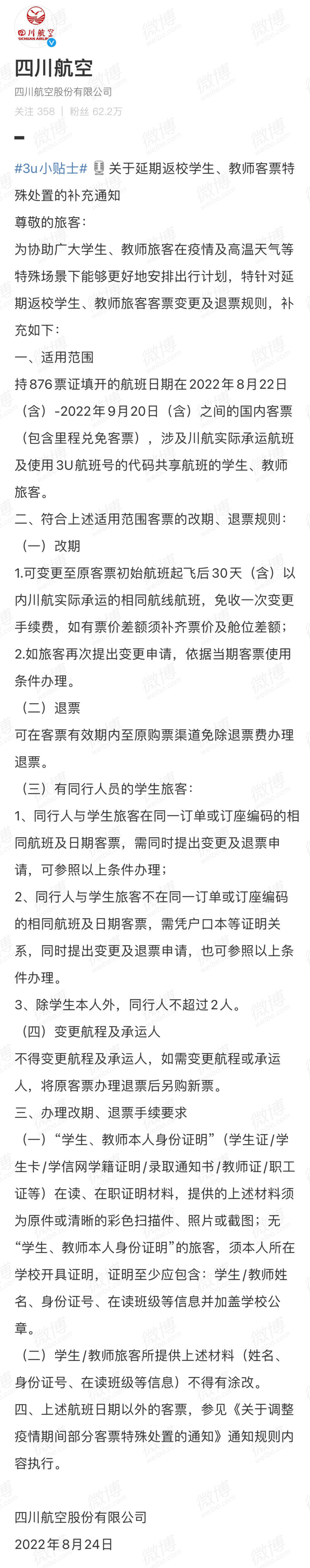 除南航外,四川航空针对延期返校学生、教师旅客客票发布变更及退票规则。