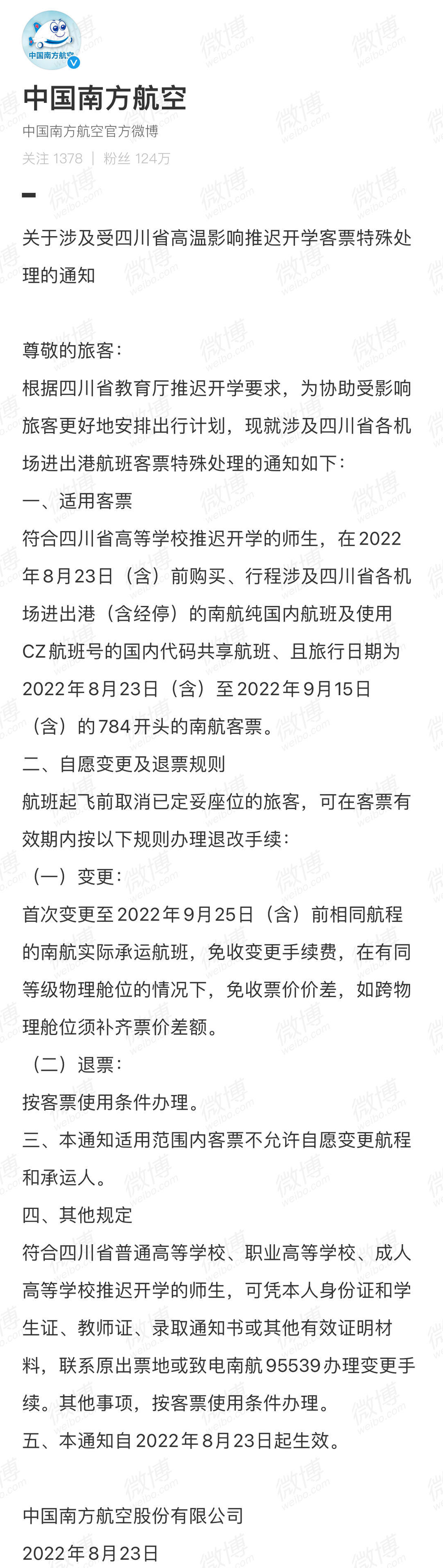记者24日从中国南方航空获悉,根据四川省教育厅推迟开学要求,为协助受影响旅客更好地安排出行计划,南方航空对涉及四川省各机场进出港航班客票进行特殊处理。