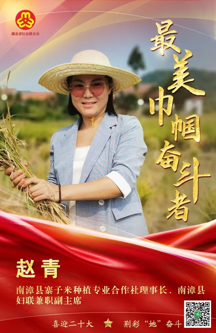 她扎根农村十载,成立农民专业合作社,采取“合作社+基地+农户(贫困户)”模式,带领没有一台收割机的湖北省南漳县上泉坪村实现全村机械化种植,解决上泉坪村1000多户留守老人、妇女的就业问题,使留守村民户均年收入增加1500多元;她推广的优质粮种和最新育秧技术,使300多名农户增加收入50多万元;2018年,她当选中国妇女第十二次全国代表大会代表,先后荣获“全国巾帼建功标兵”“全国农村青年致富带头人”“全国巾帼新农人”等荣誉称号。她,就是南漳县东巩寨子米种植专业合作社理事长赵青。
