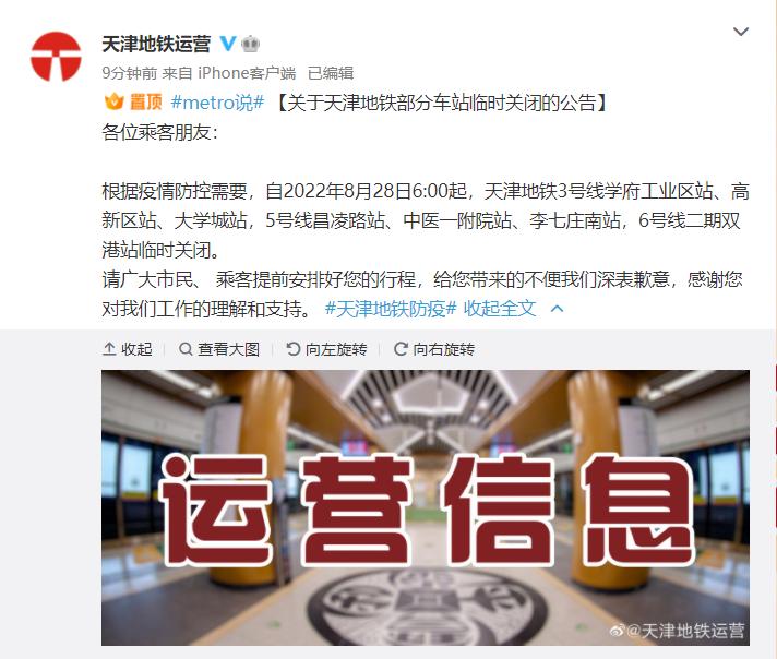 根据疫情防控需要,自2022年8月28日6:00起,天津地铁3号线学府工业区站、高新区站、大学城站,5号线昌凌路站、中医一附院站、李七庄南站,6号线二期双港站临时关闭。