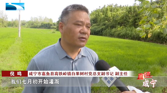咸宁市嘉鱼县高铁岭镇白果树村党总支副书记、副主任 倪鸣:“身后这片田有40多亩,我们七月初开始灌溉,抢种的是一季晚稻。现在水源充足,水稻长势茂盛,应该可以丰收的。”