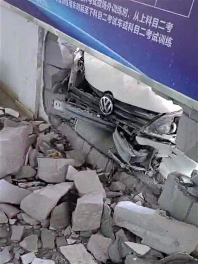 现场视频显示,一堵墙被撞出了一个大窟窿,墙上挂着驾考考试的相关信息,墙内地面上散落着大大小小的砖块,一辆白色考试车车头受损严重。