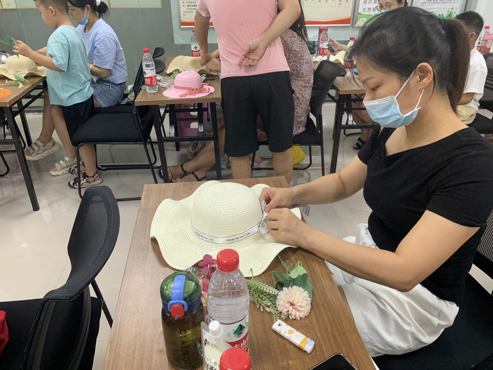 活动开始前,工作人员就将活动桌布置好,准备好了活动所需材料:草帽、花料、装饰品、胶水等。活动中,居民们积极参与,在工作人员的耐心讲解下,居民们迫不及待地拿起装饰物品来开始设计自己的草帽。在一片欢声笑语中,一顶顶精美的草帽诞生了。此次活动中有一位特殊的参与者,一位准妈妈,她很幽默地说“我现在在给肚子里的孩子进行胎教,能在社区给没出世的孩子做顶帽子,真是太有意思了!”戴上亲手设计的草帽,居民们脸上挂满了满足的笑容。