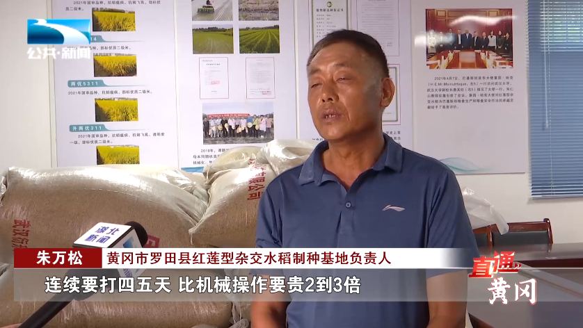 黄冈市罗田县红莲型杂交水稻制种基地负责人 朱万松:“以前1200亩田机械打药要花8400块钱,现在改为人工,一天要花4000多,连续要打四五天,比机械操作要贵2到3倍。”