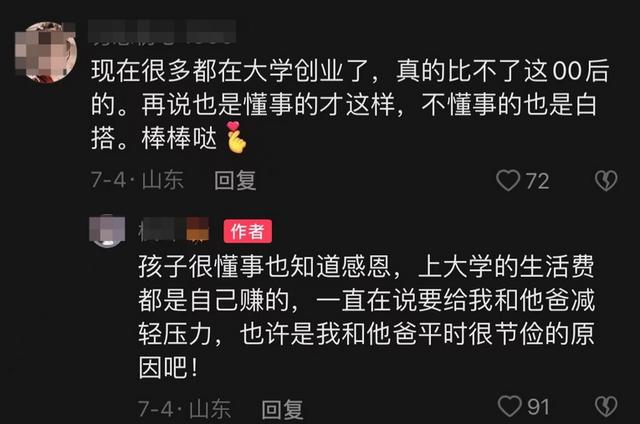翻看男孩妈妈的账号,发现从7月初到8月31日,这位妈妈记录了儿子送外卖的全过程,最高一条视频点赞量超36万。面对网友们的夸赞,她回复称:“孩子很懂事也知道感恩,上大学的生活费都是自己赚的,一直在说要给我和他爸减轻压力,也许是我和他爸平时很节俭的原因吧!”