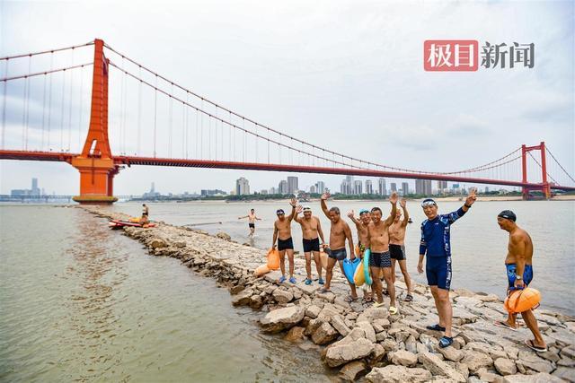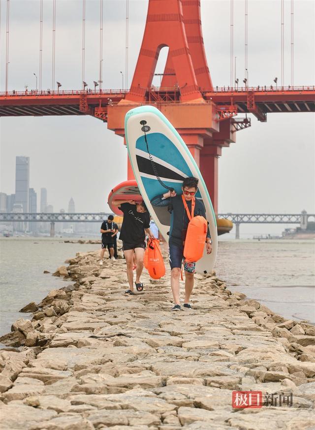 在“丁字坝”上行走,吹着凉风,江水在脚下拍打,让人感到十分惬意。记者看到,此时,约有百余位市民“抢滩登陆”,有直接游泳而来的,还有人是从岸边划着桨板来的,纷纷来此一睹江心风景,十分热闹。