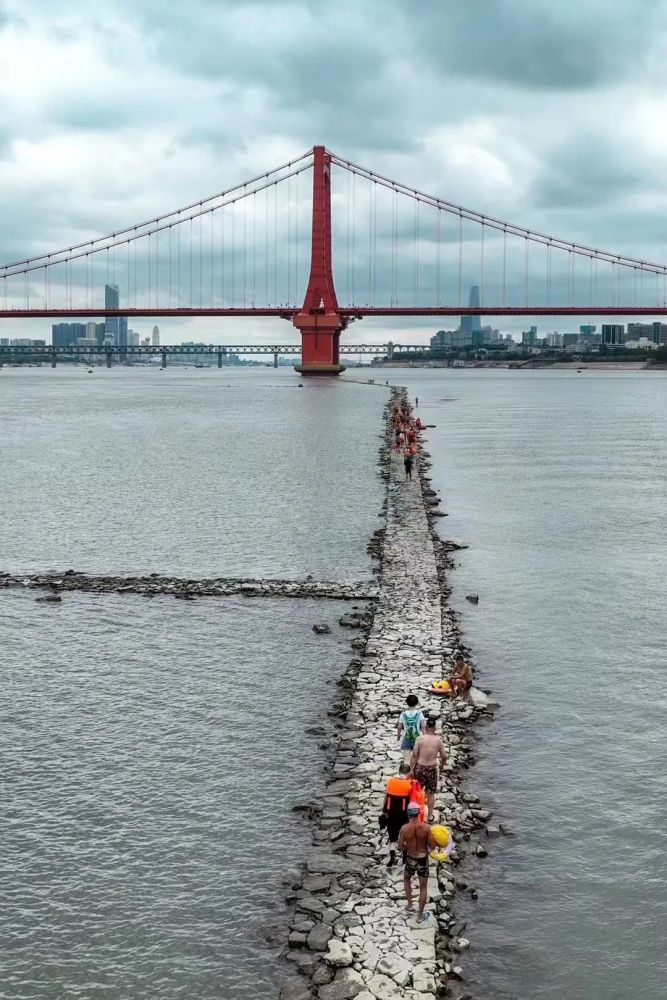 近期,长江江水位出现“新低”,在武汉鹦鹉洲长江大桥的上游水域,显露出了一条江心小道。这两天,一组拍摄于此处的唯美照片,迅速在各大社交媒体上刷屏,引得不少市民游客纷纷来此“抢滩登陆”。