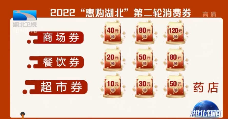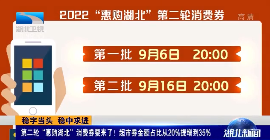 9月6号晚上八点,第二轮第一批“惠购湖北”消费券将准时投放。本批次计划发放约1343万张、3.95亿元消费券,其中商场券227万张、餐饮券312万张、超市券804万张。消费券的种类和面额没有变化,但是第一轮中核销率最高的超市券的占比会提高,药店也纳入超市券的核销范围。