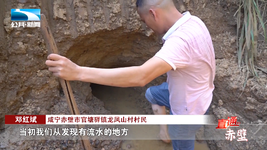咸宁赤壁市官塘驿镇龙凤山村村民 邓红斌:“当初我们从发现有流水的地方,往这个泉眼挖,大概挖了200多米,往下面挖了大概两米五左右深,才发现这么大的水在下面哗哗地流。”