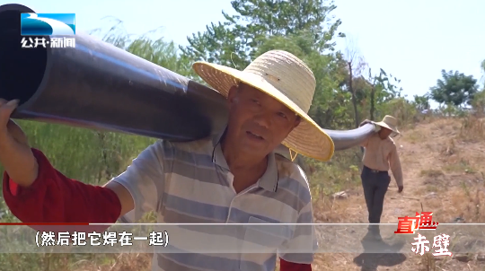 由于长江水位持续下降,想要把长江水抽到田里并不容易,首先要解决的就是临时泵站到蓄水池的管道问题。村民们要把短管道一节节地扛到指定位置,然后再焊接起来。在烈日的炙烤下,黑色的水管格外烫手。