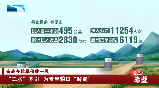 截止目前,赤壁市共投入各种水泵495台套,累计投入资金2830万元,投入劳力11254人次,启动抗旱泵站6119座,确保有水源的农田都能得到有效灌溉。