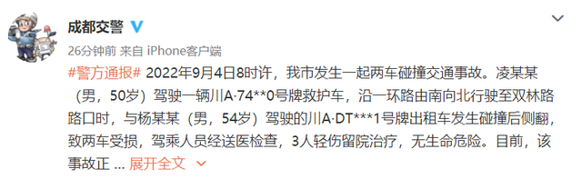 2022年9月4日8时许,成都市发生一起两车碰撞交通事故。凌某某(男,50岁)驾驶一辆川A·74**0号牌救护车,沿一环路由南向北行驶至双林路路口时,与杨某某(男,54岁)驾驶的川A·DT***1号牌出租车发生碰撞后侧翻,致两车受损,驾乘人员经送医检查,3人轻伤留院治疗,无生命危险。目前,该事故正在依法调查处理中。
