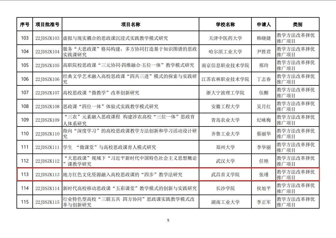 近日,教育部社科司公布了关于2022年度高校思想政治理论课教师研究专项一般项目立项的通知(教社科司函〔2022〕103号),武昌首义学院马克思主义学院副院长张瑾教授主持的《地方红色文化资源融入高校思政课的“四步”教学法研究》获批教育部高校思政课教师教学方法改革择优推广项目。该校是此次唯一获批立项此类项目的湖北省民办高校。