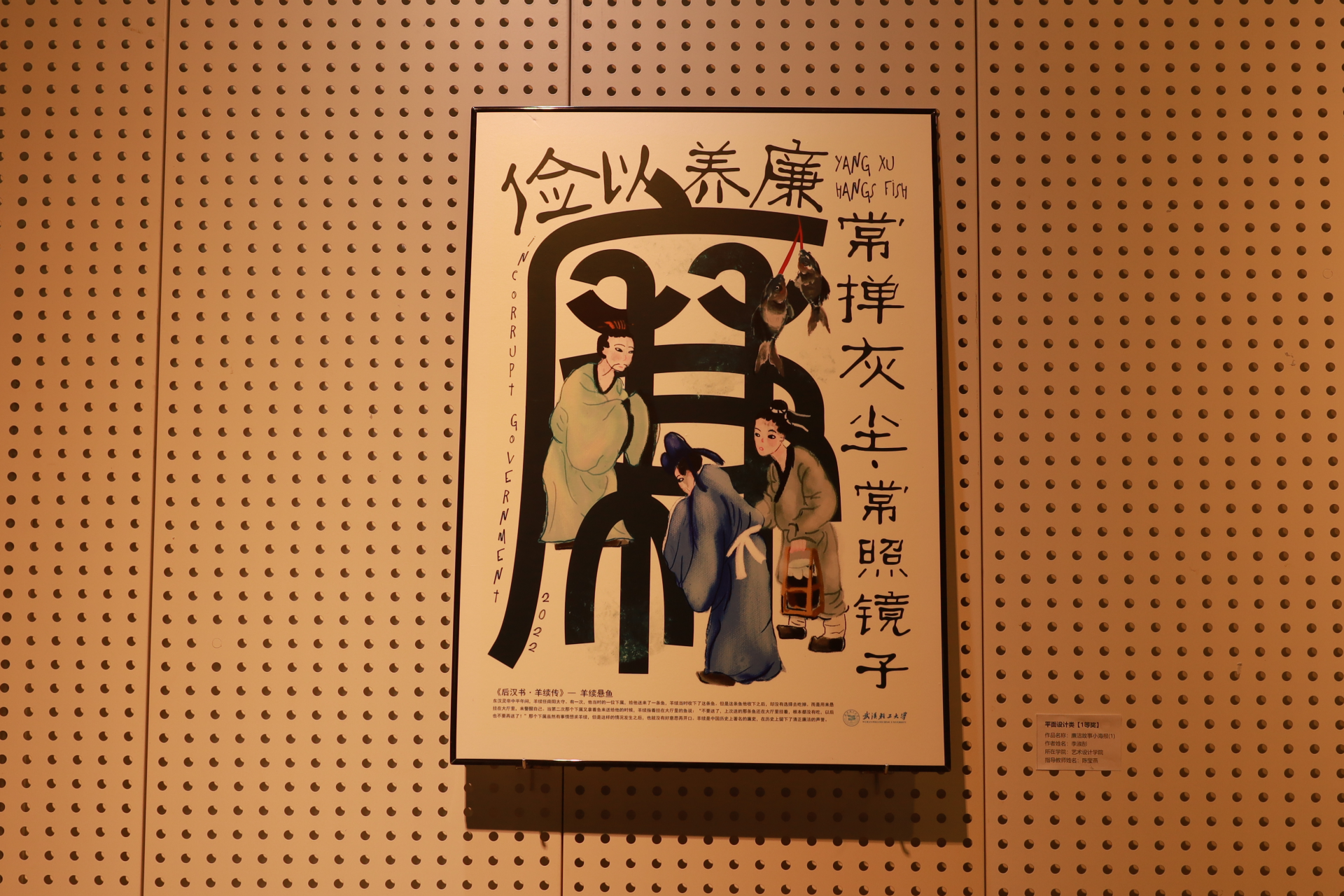 “羊续悬鱼、苏轼勤俭为人、杨震廉洁从教”,一组讲述廉洁故事的小海报吸引了在场的观众,鲜活的设计犹如提醒大家要时刻铭记廉洁纪律,不触红线,守住底线,不断提高拒腐防变能力。另一幅镰刀字样的设计图,以汉字拆解的形式,寓示着用镰刀割掉金钱的欲望,告诫大家要廉政如镰,除贪奢之污,诚心待人、诚信于人、诚实做人。