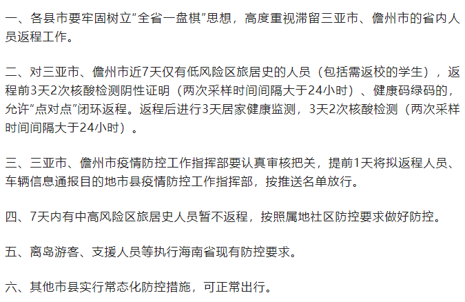 当前,海南省新冠疫情已得到有效控制,各市县已实现社会面清零。为高效做好统筹疫情防控和经济社会发展工作,现就滞留在三亚市、儋州市的省内人员有序返程通知如下: